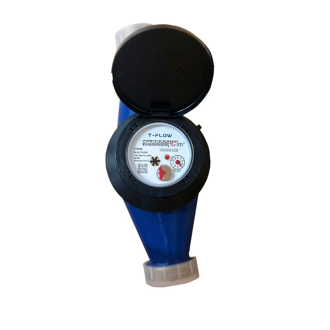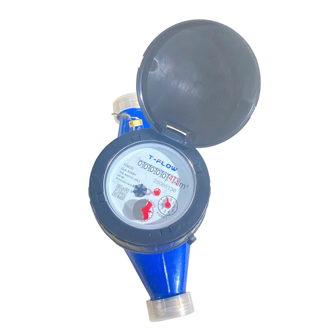 Đồng hồ nước T-FLOW TFM là loại đa tia, mặt số khô với cơ chế đo cánh quạt kết hợp bánh số và kim chỉ, dễ đọc, bền lâu và chống đóng băng. Đồng hồ có thể kết nối truyền dữ liệu từ xa qua NB-IoT, LoRa hoặc LoRaWAN, giúp quản lý tập trung hệ thống đo nước hiệu quả.